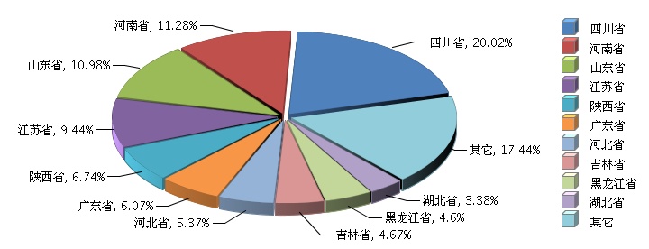 2014年度全國玻璃包裝容器制造行業(yè)主營業(yè)務(wù)收入較去年同期提升9.61%。其中四川、河南、山東三省位列三甲,四川省的主營業(yè)務(wù)收入占全國比重達到五分之一,河南、山東也都超過十分之一。其他省份中,江蘇、陜西、廣東、河北排名較高。